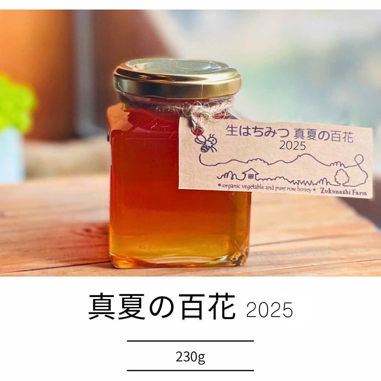 信州産 純粋生はちみつ『真夏の百花2025』230g(薬剤不使用、花粉無濾過、完全非加熱、砂糖無給餌、純粋生蜂蜜)